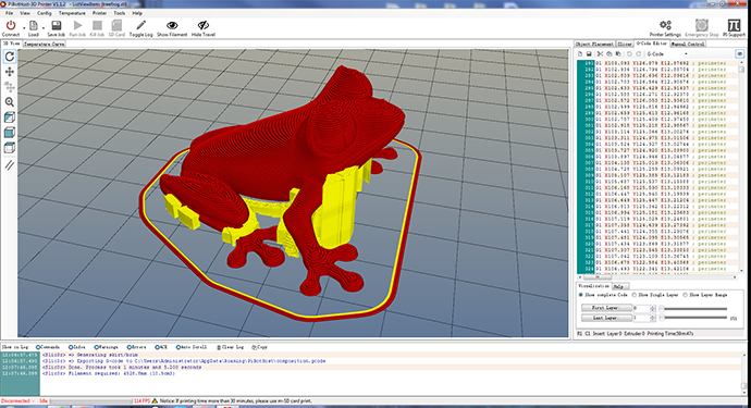 3.Import a Model, Sliced with Slic3r. The picture shown is the double extruder working condition. One extruder prints the main structure and another extruder prints support structure.